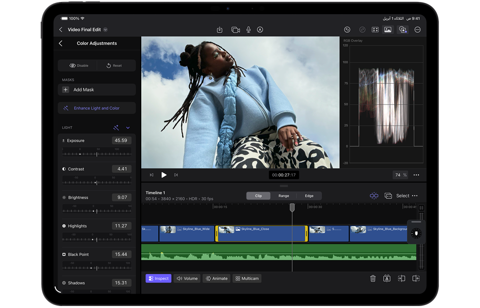 صوّر وعدّل وشارك على جهاز واحد فقط بفضل نظام كاميرات Pro وماسح ضوئي بتكنولوجيا لايدار وميكروفونات بجودة الاستوديوهات الاحترافية وأربعة مكبرات صوت. التقط فيديوهات ProRes بوضوح 4K وسجّل حلقة بودكاست واختَر الميكروفون المناسب لكل تطبيق باستخدام منتقي الإدخال.