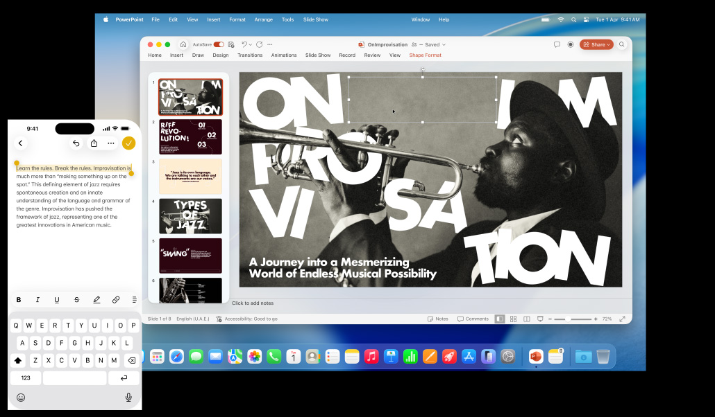 Say you start writing an email on your iPhone, but you want to finish it on your Mac. Or you start writing a report on your iMac, but want to continue on your iPad as you head to your meeting. Handoff makes it possible — and totally seamless. When your Mac and your iPhone or iPad are near each other, they can automatically pass what you’re doing from one device to another.4 An icon representing the last app you were using will appear on your second device — in the Dock on your Mac or iPad or in the App Switcher on your iPhone. Just click or tap to pick up right where you left off without having to search for the file. Handoff works widely across the system and can even work with third‑party apps.