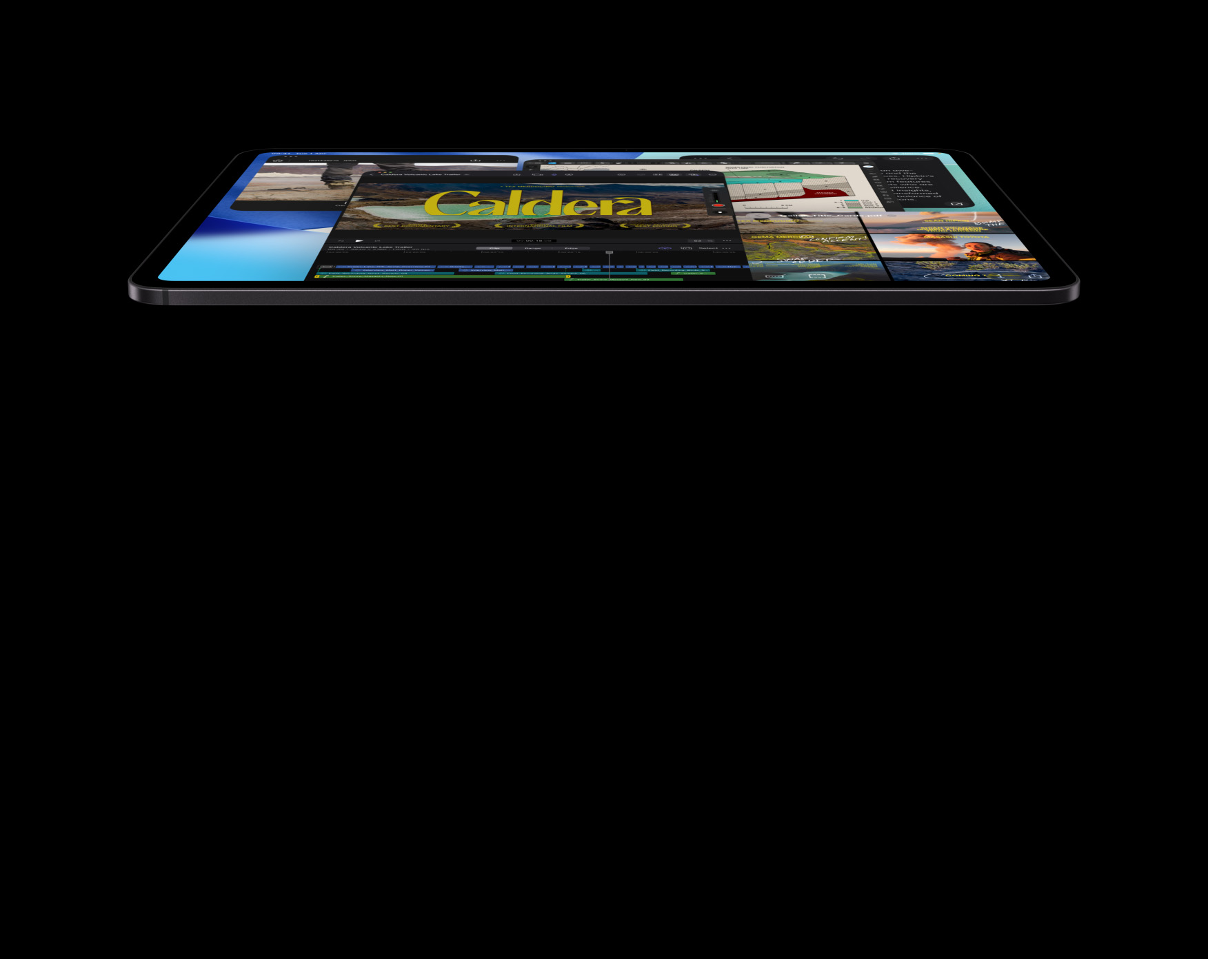 iPad Pro, front exterior, landscape orientation, space black colour, attached to Magic Keyboard, black colour, display with multiple app windows: Final Cut Pro with multiple video editing features and timeline, Maps app, Notes app, media clips